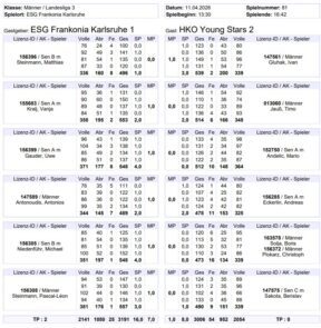 Oli legte zu Beginn mal richtig los und seine Gegnerin machte das komplette Gegenteil – ein leichter Gewinn des SP. Scheinbar ließ sich Oli von der schlechten Leistung anstecken und plötzlich ging so gar nichts mehr zusammen. Das führte zum Verlust dieses Durchgangs. Nun besann Oli wieder darauf was Kegeln ist – nämlich das Weiße treffen. HKO wechselte, was jedoch keinen Erfolg brachte. Die Einwechselspielerin hatte die gleichen Probleme mit der Bahnanlage. Oli holte sich den wichtigen dritten Durchgang und trotz einer schlechten letzten Bahn war der SP und der MP bei uns.