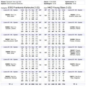 Johann begann sehr konzentriert und zeigte endlich mal auch wieder, dass er im Abräumen die weißen Gegenstände treffen kann. Wohl überrascht vom eigenen Können, klappte es auf der nächsten Bahn so gar nicht mehr. Ihr könnt es ahnen – der SP war weg. Wie auf einer Achterbahn ging es nun endlich wieder aufwärts – Johann traf und traf – und das war auch wichtig, damit er sich diesen SP schnappen konnte. Auf der letzten Bahn befand sich Johann wieder auf Talfahrt – in die Vollen wollte gar nichts mehr gelingen und sein Gegner holte Holz um Holz auf. Zum Glück traf er im Abräumen wieder besser und sein Gegner baute ab. Durch die SP-Teilung war die Holzzahl der entscheidende Faktor für den MP-Gewinn von Johann.