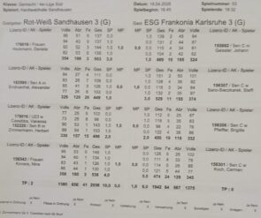 Wie erging es Brigitte? Obwohl nicht gerade berauschend gespielt, hatte sie ihre Gegnerin voll im Griff und holte Durchgang 1 und 2 jeweils den SP. Aber das fiel der Heimmannschaft Sandhausen natürlich auch auf. Sie holten ihr Ass aus dem Ärmel und schickten den Ersatzspieler auf die Bahn. Nun war es aus mit Brigitte und sie traf kein Scheunentor mehr bzw. nur noch wenige Kegel. Das Ergebnis kann man sich denken: SP und MP weg und somit auch der Sieg.