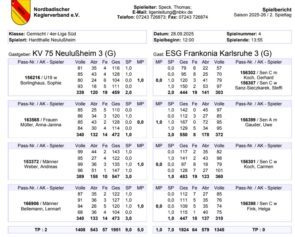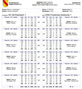 2:0 TP, 6:2 MP, 10:14 SP und 3262:3242 Holz