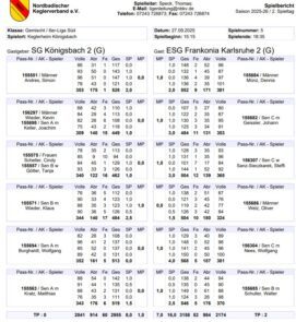 Walter fand sehr schnell zu seinem Spiel und erzielte auch ein achtbares Ergebnis, jedoch tat es ihm sein Gegner gleich (nur ein wenig besser) – darum ging der SP an Königsbach. Der zweite Durchgang war spannend bis zum letzten Wurf – sie entschieden sich zur Punkteteilung. Bei Walter ging es nun weiter bergauf – im Gegensatz zu seinem Gegner. Walter holte sich den dritten Durchgang klar. Dies übertrug sich auf die letzte Bahn. Nachdem die Spannung weg war, ging es nur noch um das Ergebnis – leider war nun bei Walter die Luft raus und er verpasste ein Topergebnis – zum MP und zum Sieg reichte es in jedem Fall.